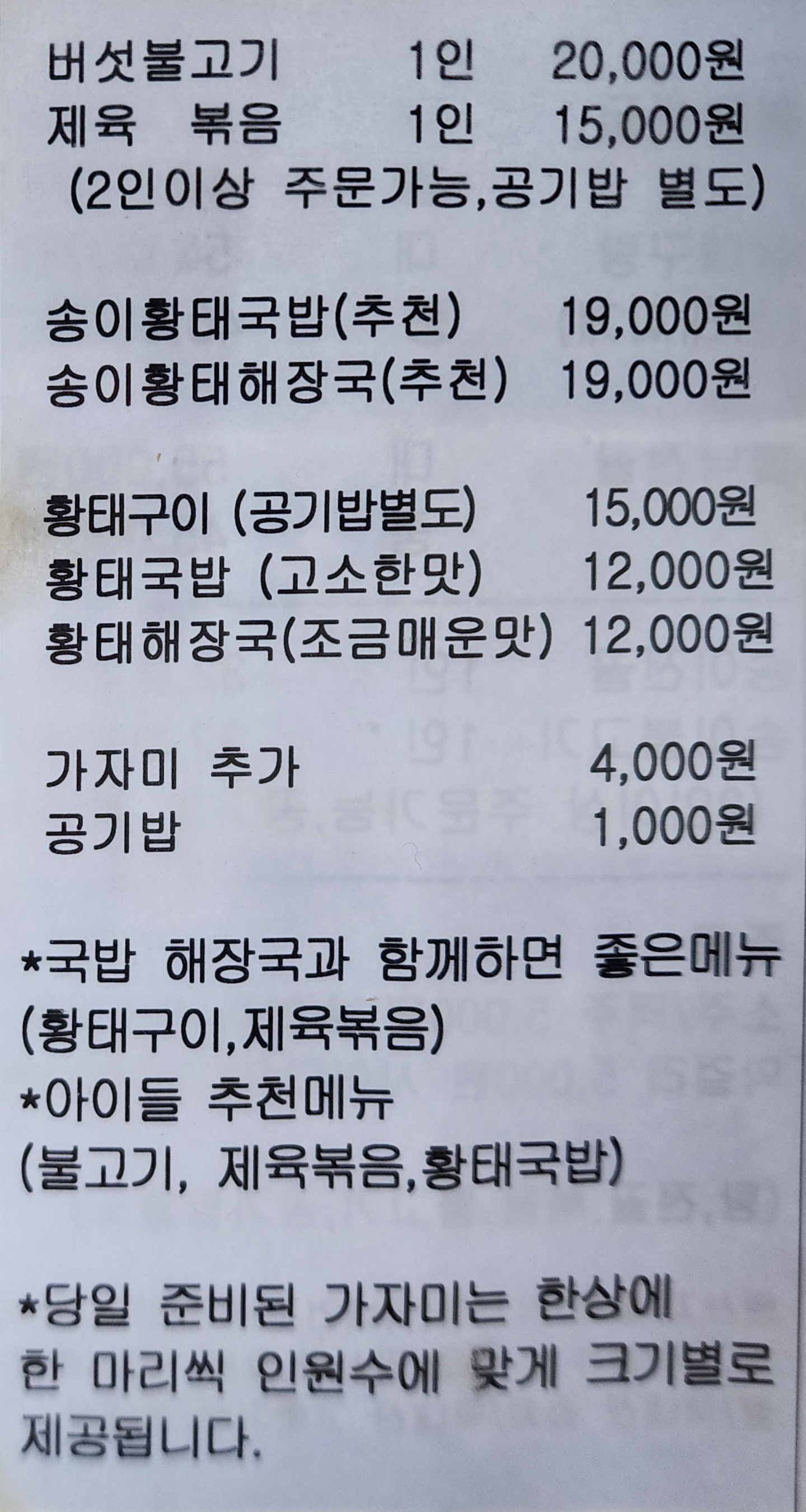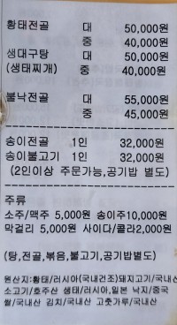 맛 5.30/6 가성비 1.40/2 서비스&청결 1.30/2흔히 생각하는 맑은 황태국이 아닌 누룽지처럼 진하고 고소한 국물이 황태죽에 가깝다. 뒤적여봐도 황태가 안 보이는걸 보면 갈아서 넣은 것 같다. 외유내강 잔잔해 보이는 비주얼로 진하게 기억에 남는 맛. 같이 나오는 가자미 구이도 실하고 반찬들도 하나같이 맛있다. 특히 청어알, 오징어, 낙지, 여러 씨앗이 들어간 씨앗젓갈이 짜지 않아 곁들이기 좋아서 계속 손이 간다. 오후 3시까지 영업하지만 재료 떨어지면 일찍 닫으니 서둘러 움직여야한다.0 0신고하기