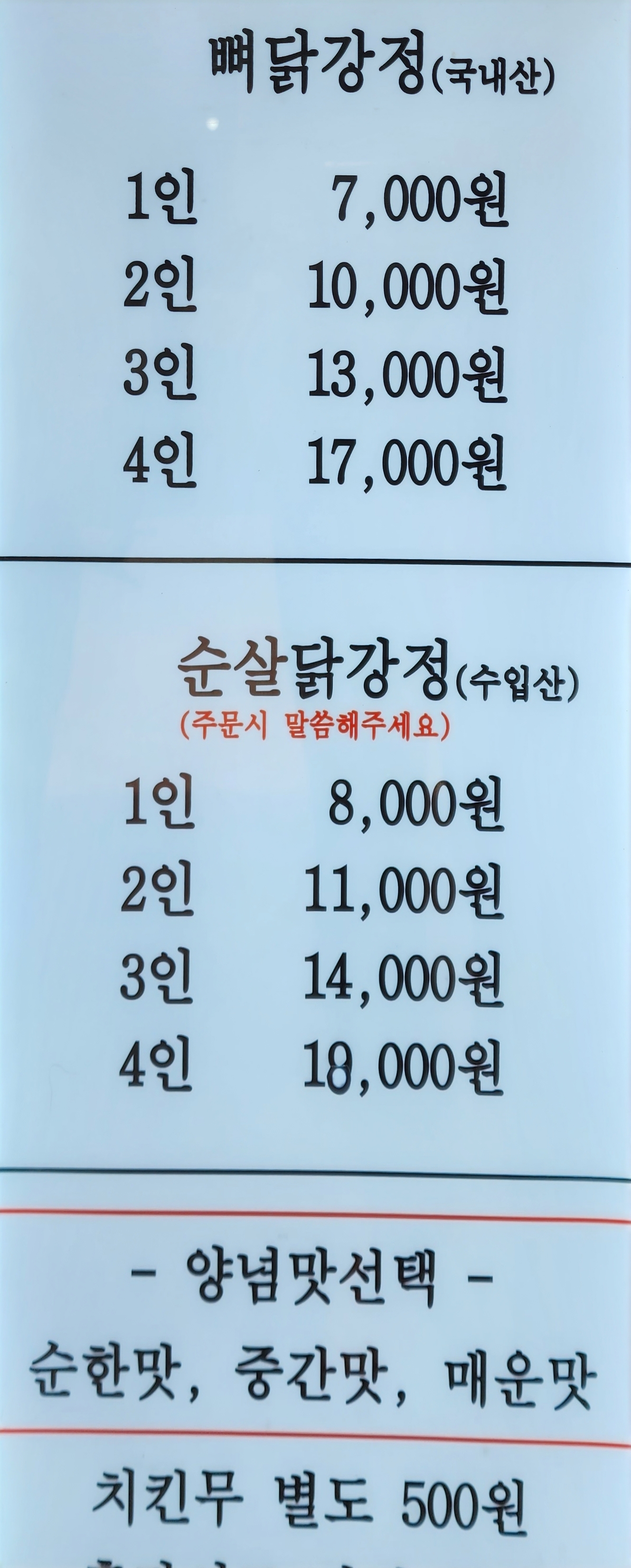 맛 4.20/6 가성비 1.50/2 서비스&청결 1.10/2포장만 가능해 현장감을 느끼기 어렵지만 가성비 좋게 뼈닭강정을 먹을 수 있다. 물엿 많이 들어간 달달한 시장 닭강정 맛0 0신고하기 -